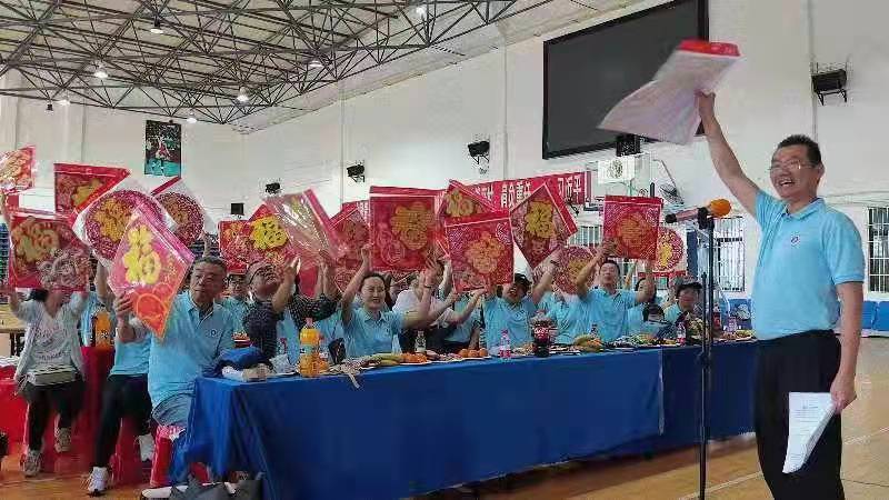 之后,进入趣味运动比赛项目,其分为大众集体比赛项目和个人娱乐项目,其中大众集体比赛项目有背夹球接力、两人三足、过河拆桥、定点投篮和五子棋等五项,个人娱乐项目有套圈和才艺展示。大众集体比赛项目,根据报名人数按照年龄、性别分为A、B两队,两队的男队员和女队员人数均衡,确保实力基本均衡。