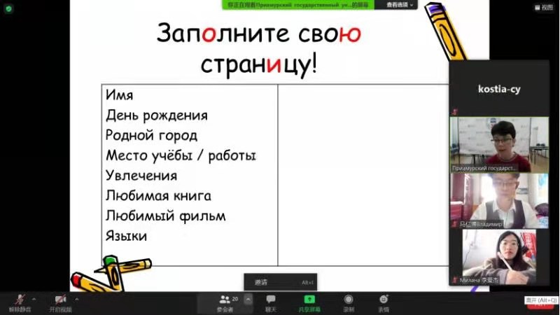 2021年1月18日下午2点,俄罗斯阿列赫姆阿穆尔沿岸国立大学Спивакова Е.М.老师通过zoom网络,开始给yl7703永利俄语专业学生进行培训,拉开了小学期线上培训序幕。此次培训课上从相互认识开始,同学们利用学过的知识,介绍自己的家乡、爱好等。