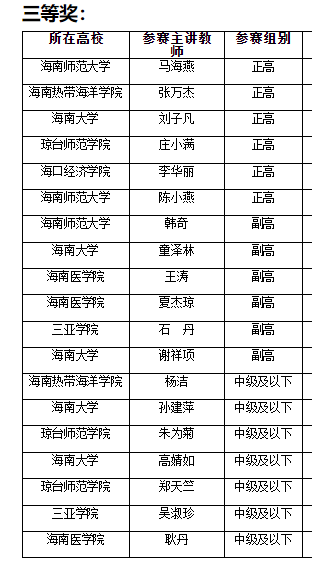 4月16日,我院杨洁、刘彬、王佳音等老师组成的教师团队参加了海南省教育厅举办的第二届全国高校教师教学创新大赛(海南赛区),并荣获海南赛区三等奖。