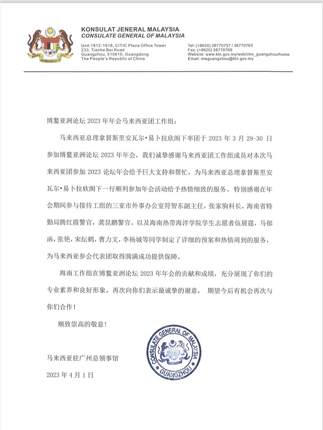 参与服务具有如此巨大影响力的国际盛会,对语言类学生来说是非常重要和宝贵的锻炼机会。为此英语专业陈钦炳老师积极联系三亚市外事办公室,为同学们争取到为马来西亚来访团进行志愿服务的机会。在学院党政领导的高度重视和精心指导下,课程负责人杨洁老师精心遴选伍展霆、马郁函、张艳、宋纭鹤、曹力文和李杨城同学参与志愿服务工作。在陈钦炳老师的带领下,他们以良好的专业素养和高昂的精神状态很好地完成了由马来西亚总理拿督斯里安瓦尔●易卜拉欣阁下率领的马来西亚代表团的随团服务工作,受到代表团高度肯定和赞扬,并在会后收到了马来西亚驻广州总领事馆发来的感谢信。