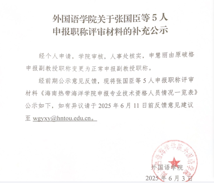 yl7703永利关于张国臣等5人申报职称评审材料的补充公示