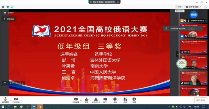 据悉,由教育部主办的全国高校俄语大赛是我国俄语界最高级别的国家赛事,是培养和选拔优秀俄语人才的最好方式。此次赛事是由教育部国际合作与交流司主办、辽宁省教育厅协办、大连外国语大学承办,本届大赛通过线上举行。