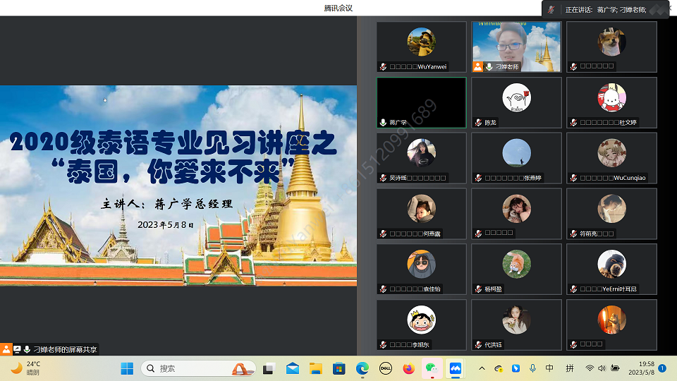 基于当前就业市场的宏观背景,结合专业学生求职方面的实际需求,为帮助学生准确有效地确定就业目标,尽快在思想上、行动上做好就业准备。 5月8日晚上19:00,yl7703永利泰语专业举办就业困惑答疑活动,此次活动邀请了奥金物流公司创始人蒋广学总经理,采取线上方式为学生们进行讲解分享。泰语专业负责人刁婵老师、课程负责人杨洪娇老师与泰语专业全体学生参加了此次活动。