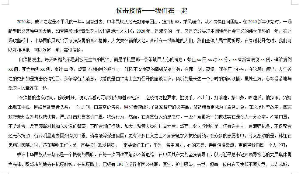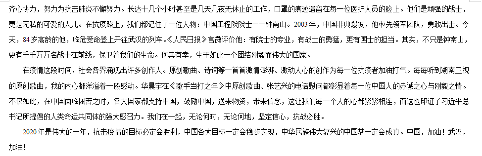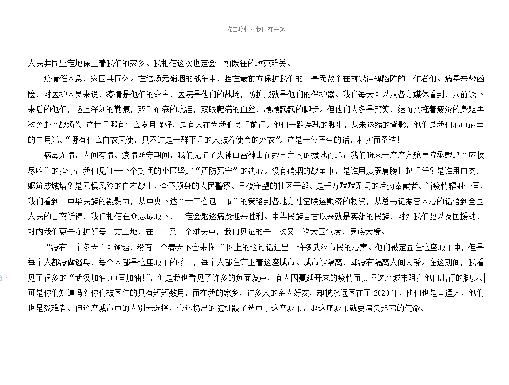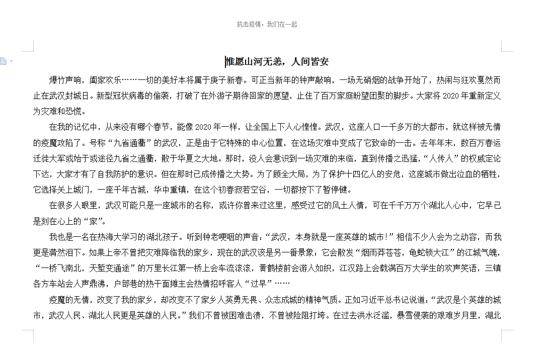 庚子鼠年,荆楚大疫。新型冠状病毒肺炎疫情牵动人心,在这场没有硝烟的战争中:身披白色“战袍”的医护人员在前冲锋陷阵,无数“逆行”英雄奔赴疫区确保物资供应,城市建造者用令世界赞叹的“中国速度”建造雷神山、火神山医院……吾辈虽不能与君同站在防疫的一线上,但可以以笔为戈,以纸为戎,与君共克时艰。为此我院开展了“同心战‘疫’,共克时艰”为主题的征文比赛,今天,我将带领大家,来欣赏一些同学的优秀作品。